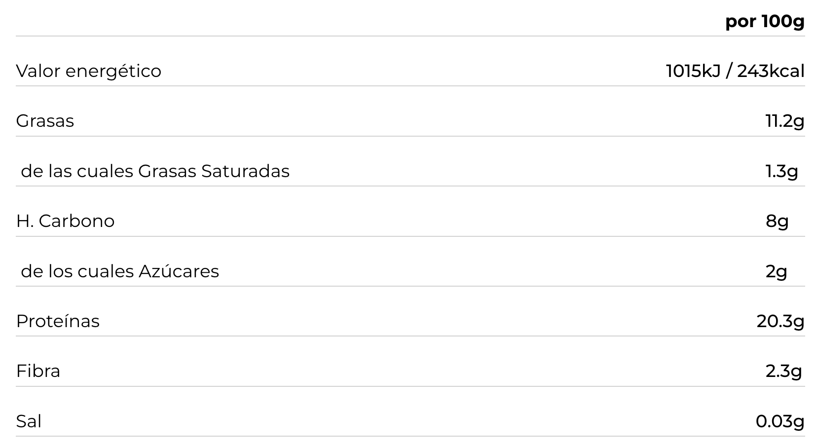 Ingredientes: Agua, proteína de girasol*, harina de garbanzo*, semillas de lino marrón*, salvado de avena*, levadura, aceite de oliva virgen extra*, psyllium*, corrector de acidez (acido cítrico). *De cultivo ecológico.